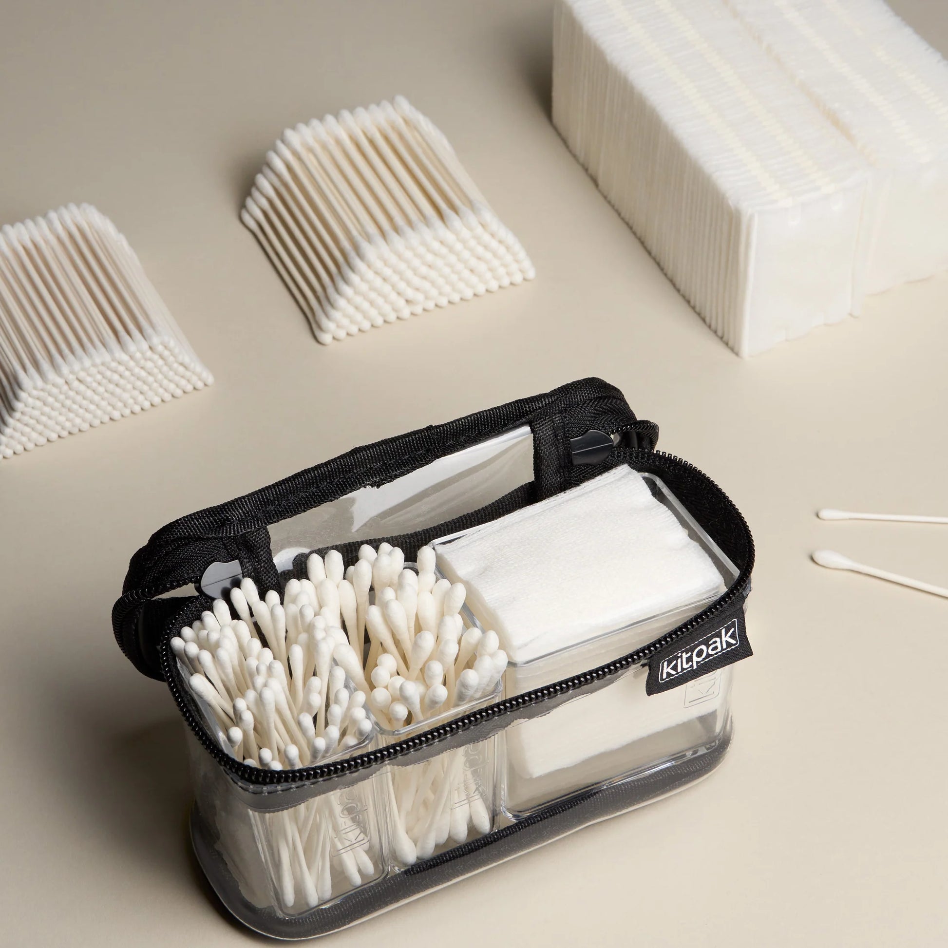 Allir starfandi Makeup Artistar munu segja þér að bómullarpinnar og bómullarskífur eru nauðsynlegir í hvaða kit sem er. Þess vegna hefur Kitpak sett saman þetta óaðfinnalega sett sem auðvelt er að fylla á með öllu sem þarf til að gera "loð"fría clean up vinnu, fjarlægja þrjóskan vatnsheldan eyeliner eða mýkja varir fyrir glossinn.